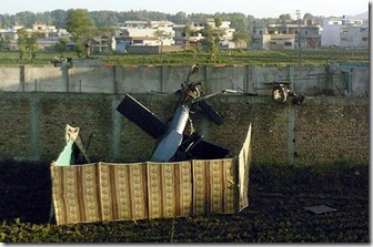 Foto-foto reruntuhan helikopter AS yang jatuh dan kemudian diledakkan oleh anggota pasukan khusus Navy SEALs membuat heboh kalangan pengamat dunia penerbangan di internet. Sisa-sisa bagian ekor, yang menunjukkan baling-baling belakang, sirip tegak, dan sayap horizontal, sama sekali tak menunjukkan ciri-ciri bagian ekor helikopter MH-60 Blackhawk, yang biasa digunakan untuk mengangkut pasukan khusus AS.